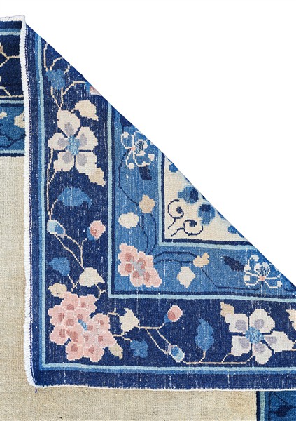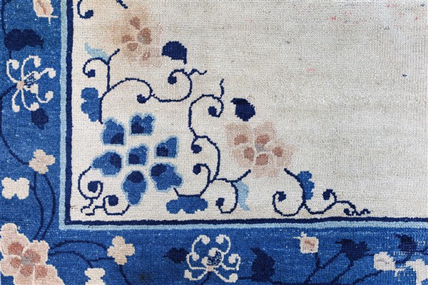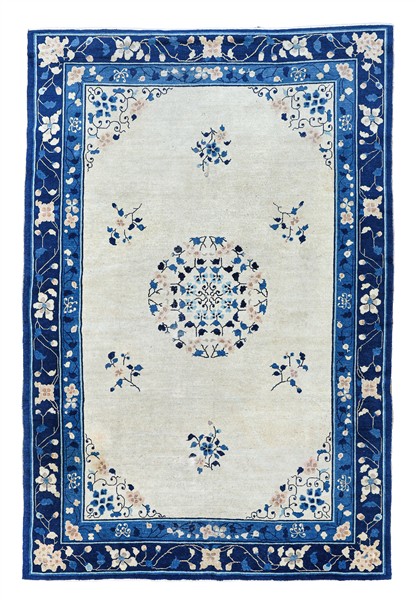 Tappeto Pekino, Cina, fine secolo XIX. Decoro con medaglione floreale su fondo beige. Bordura floreale nei toni del blu e azzurro (cm 264x183) (difetti e rapature)