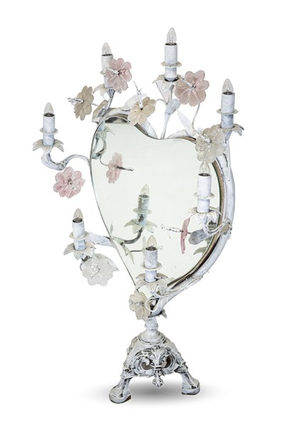 Specchiera d'appoggio in metallo verniciato bianco a forma di cuore con sette luci e decorazioni floreali in vetro (h cm 85) (difetti)