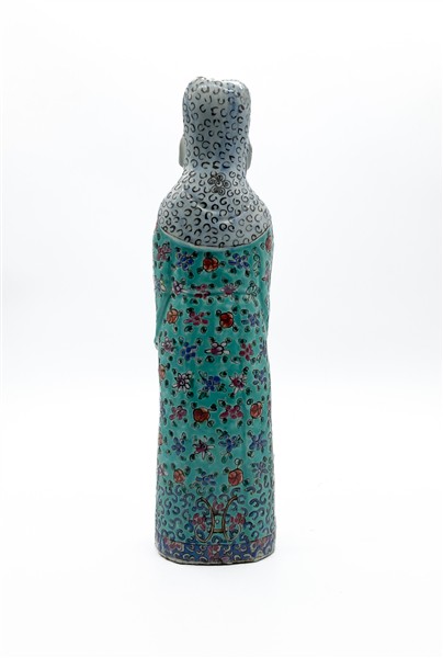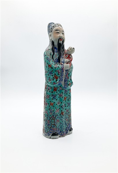 Figura di dignitario cinese con bambino in porcellana dipinta in policromia. C