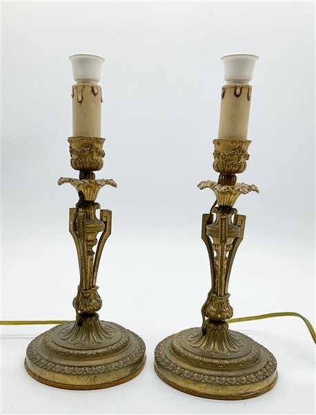 Coppia di candelieri in bronzo dorato con base circolare decorata a palmette e anse a voluta. Secolo XIX. Montati a luce elettrica in epoca posteriore (h tot cm 28,5) (difetti)