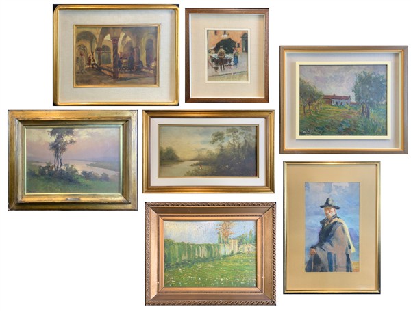 Lotto composto da sei dipinti ad olio e una tecnica mista di diversi autori, so