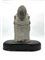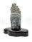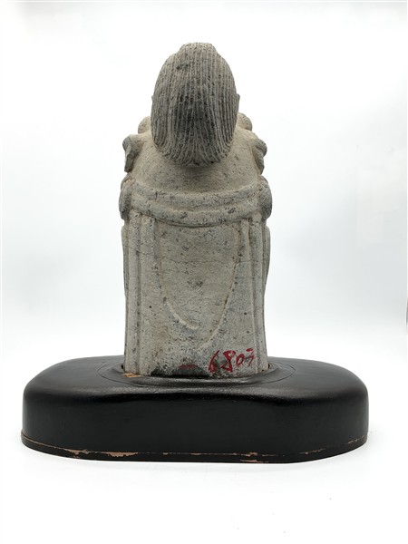 Testa di Bodishattva in scisto grigio scolpito. Cina, secolo XX. Montata su base in legno ebanizzata di forma sagomata (cm tot 43x50) (difetti)