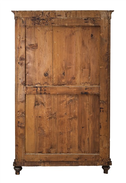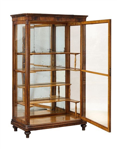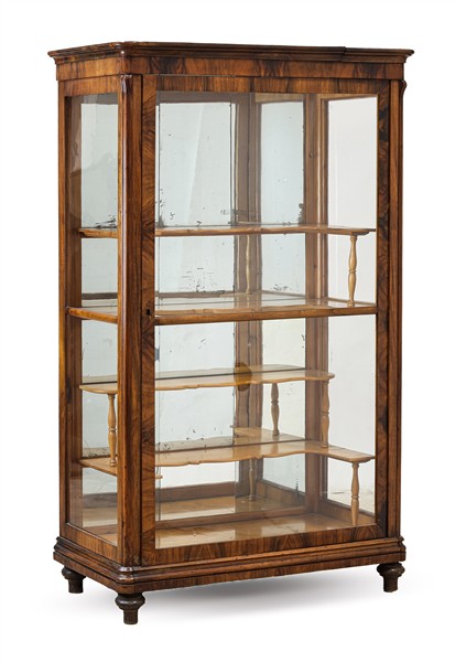 Vetrina lastronata in legni vari con fronte, fianchi a vetri con fondo specchiato, all'interno étagère tornito e sagomato a quattro ripiani. Secolo XIX (cm 100x168x46) (difetti e chiave mancante)
