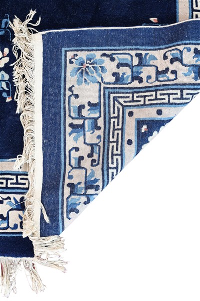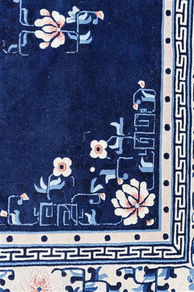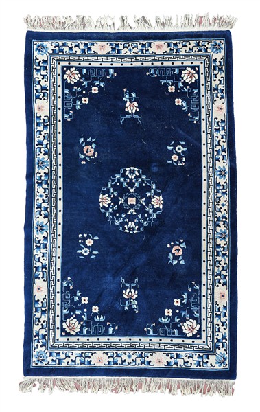 Tappeto Pekino, Cina, recente manifattura. Decoro floreale con medaglione su fondo blu Cina. Bordura interna a fiocchi di neve seguita da una greca e dalla bordura principale con decoro floreale su fondo bianco (cm 247x156) (difetti)
