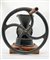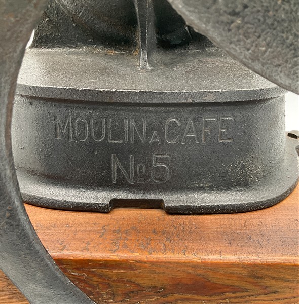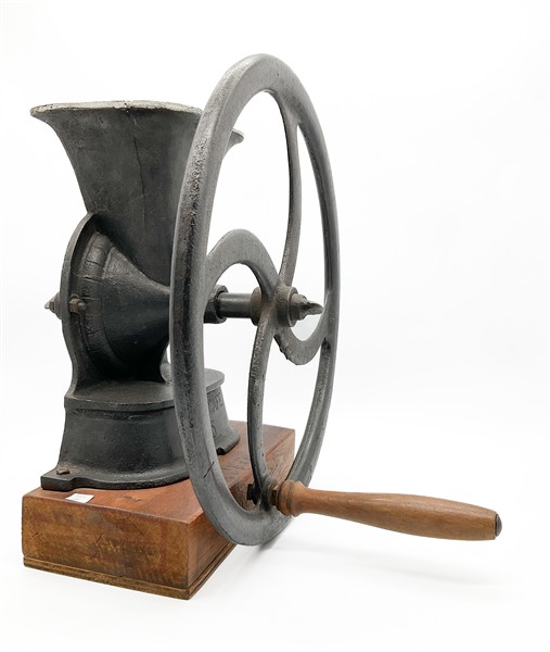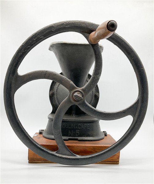 Macinacaffè a una ruota in ghisa e ferro montato su base in legno di epoca posteriore inscritto Mouline à Cafe n.5 (h cm 48) (difetti)