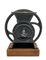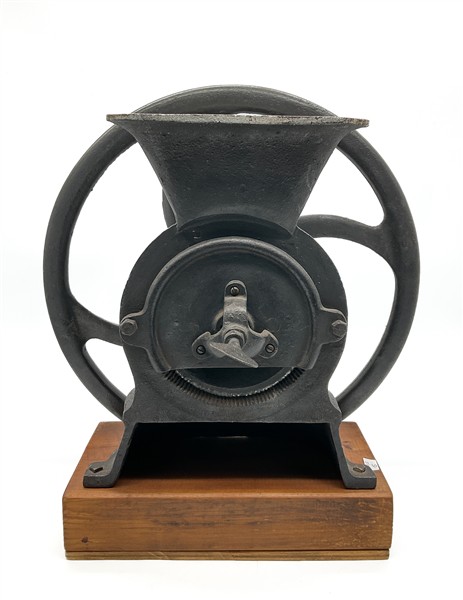 Macinacaffè a una ruota in ghisa e ferro montato su base in legno di epoca post