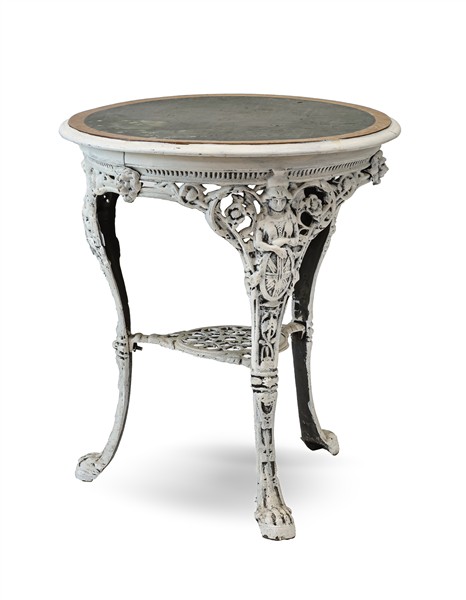 Tavolino tripode in ghisa verniciata bianca con piano circolare in legno e gambe decorate a figure reggenti scudo e piedi ferini (d cm 67, h cm 76) (difetti)