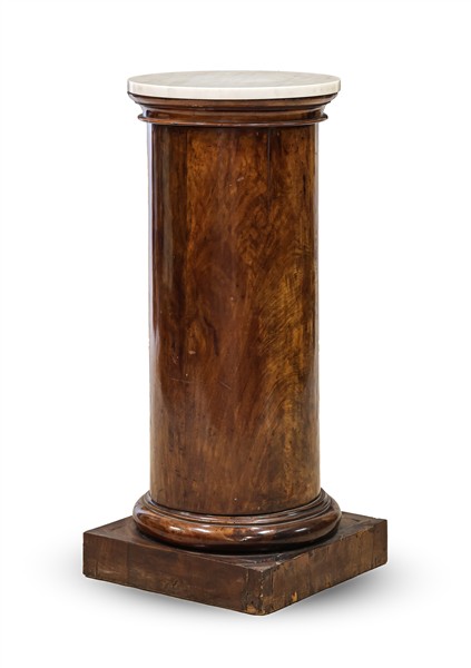 Piedistallo a colonna impiallacciato in mogano con base quadrata, piano in marm