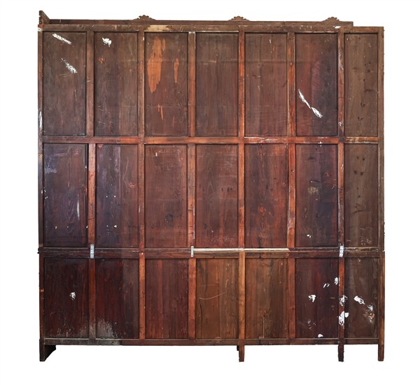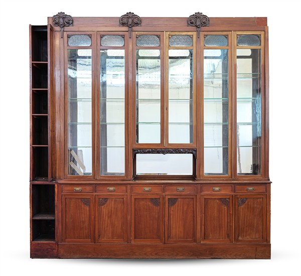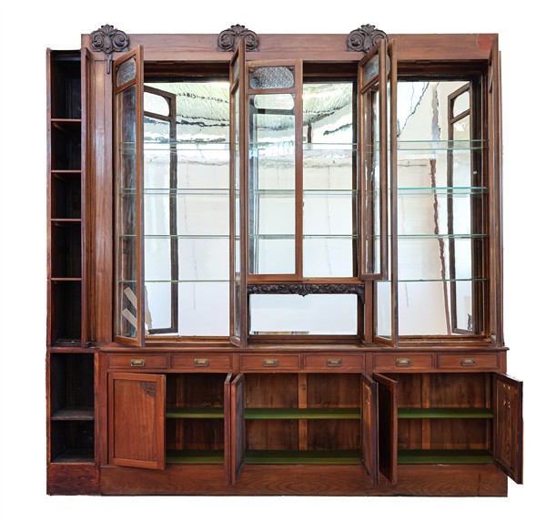 Mobile da farmacia con fondo a specchio a sei cassetti e sei ante, parte superiore tripartita con mensole e un vano a giorno decorato da cornici intagliate a motivo Liberty, montanti terminanti con fregi vegetali. Milano, inizio secolo XX (cm 310x320x38) (mancanze e restauri)