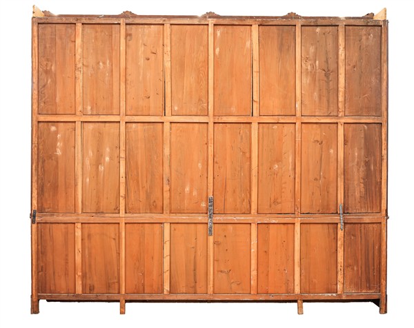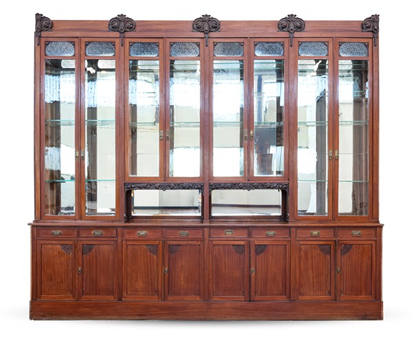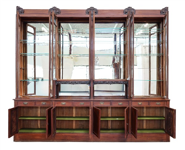 Mobile da farmacia con fondo a specchio a otto cassetti e otto ante, parte superiore con ante a vetri e due vani a giorno decorati da cornici intagliate a motivo Liberty, montanti terminanti con fregi vegetali. Milano, inizio secolo XX (cm 369x320x38) (difetti)