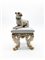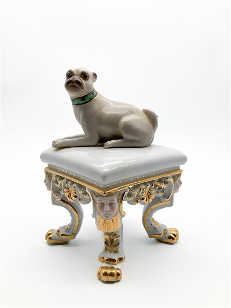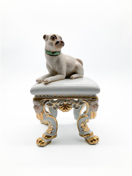 Manifattura del secolo XX. Figura di cane carlino seduto su panchetto in porcel