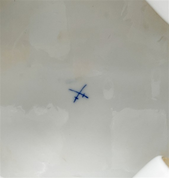 Manifattura del secolo XX. Figura di cane carlino seduto su panchetto in porcellana policroma con profili in oro. Marcato sotto la base (cm 13x20x13) (lievi difetti)