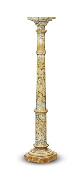 Colonnina in alabastro con fusto tornito, base e piano quadrati con angoli smussati (h cm 114,5, piano cm 18,5x18,5) (difetti e mancanze)