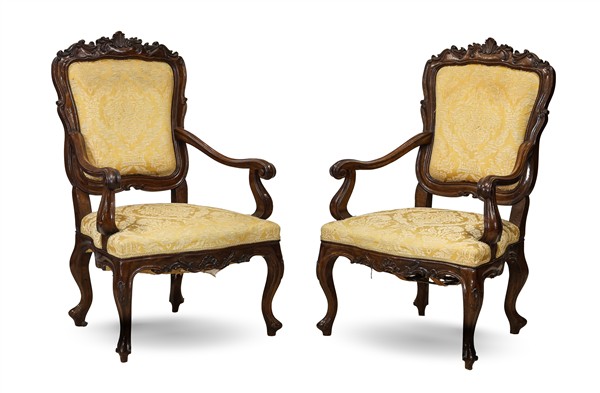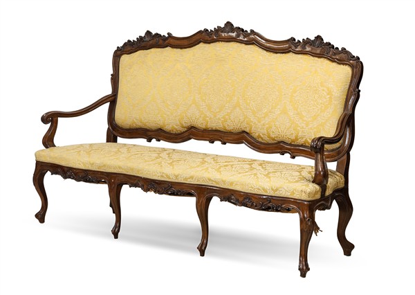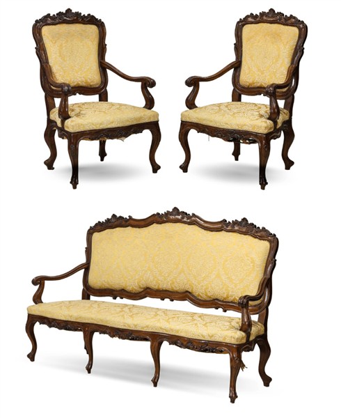 Fornitura da salotto in noce intagliato composta da divano a tre posti e coppia di poltrone, braccioli terminanti a ricciolo e gambe mosse. Secolo XIX. Seduta e schienale imbottiti e rivestiti in tessuto operato giallo (L max cm 202) (difetti)