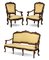 Fornitura da salotto in noce intagliato composta da divano a tre posti e coppia