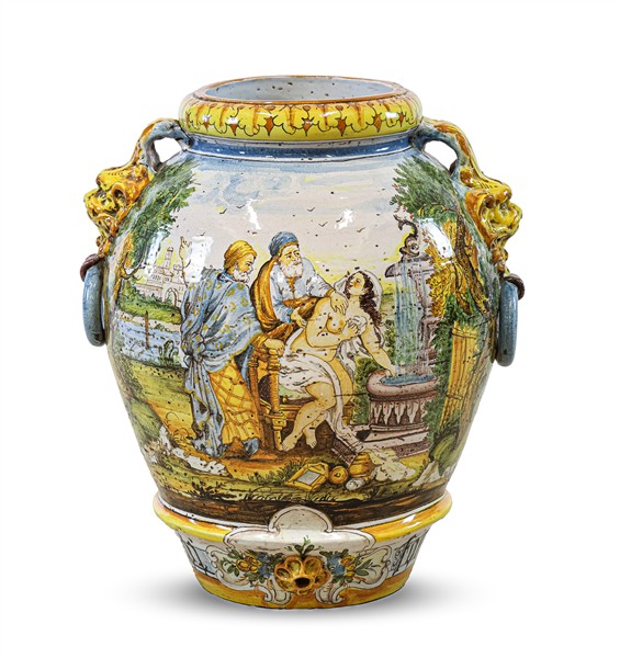 Grande orcio biansato in maiolica dipinta in policromia con fronte decorato a paesaggio, Susanna e i vecchioni e iscrizioni, anse a teste leonine anellate (h cm 61) (difetti e restauro ad un'ansa)