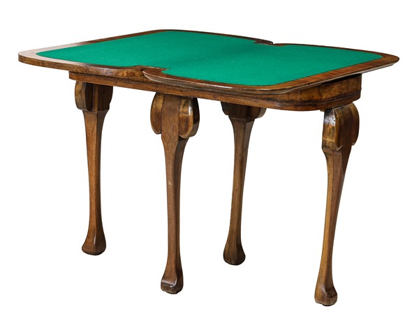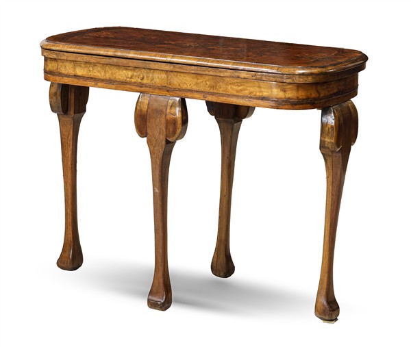 Tavolino da gioco lastronato in radica e filettato in legni chiari con piano a libro e gambe mosse. Inghilterra, secolo XIX (cm chiuso 93x73x46) (difetti)