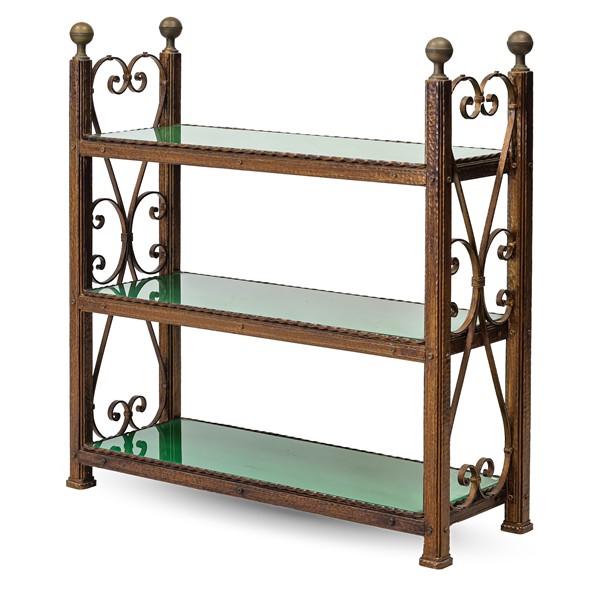 Lot 1429 | Étagère in ferro battuto e altri metalli a tre ripiani in vetro, montanti termi