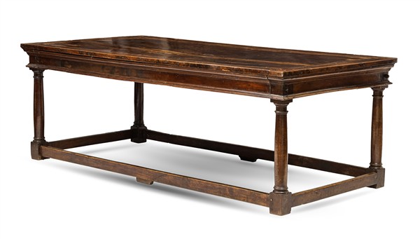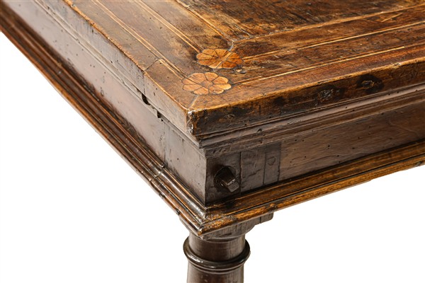 Tavolo in noce ed altre essenze con gambe a colonna tornita riunite da traverse, piano filettato con intarsi floreali agli angoli. Fine secolo XVII (cm 236x80x109) (difetti, restauri e sostituzioni)