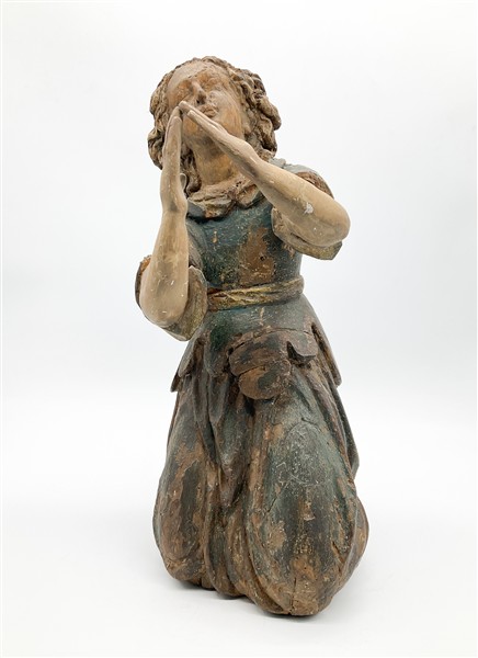 Arte del secolo XVIII. Scultura a tuttotondo di angelo orante in legno laccato