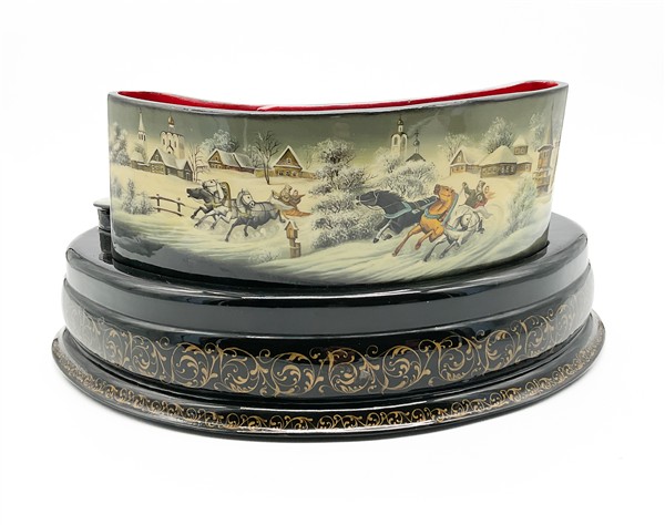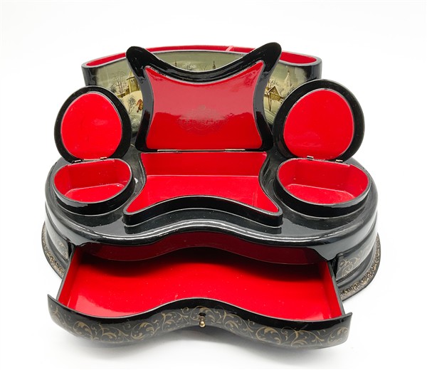 Arte russa del secolo XX. Calamaio in legno e papier-machè dipinto in policromia a paesaggi innevati con figure su fondo nero. Decori in oro. Firmato sul coperchio centrale (cm 36x16x26) (lievi difetti)