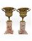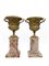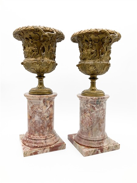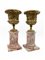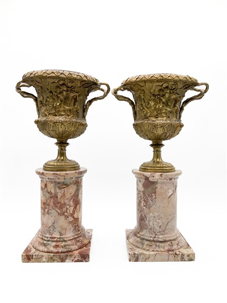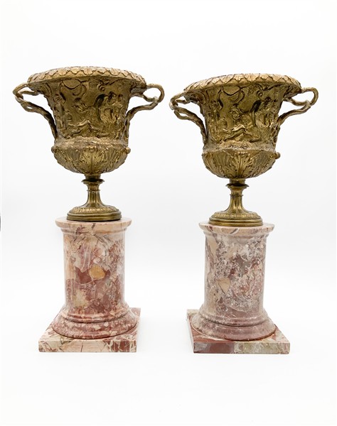 Coppia di vasi in metallo dorato decorato a giochi di putti con doppia ansa a tralci di vite, sostegno a colonna in breccia con base quadrata (h cm 43) (difetti)