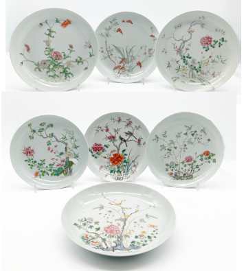 Lotto composto da sette piatti in porcellana Famiglia Rosa con decoro floreale,