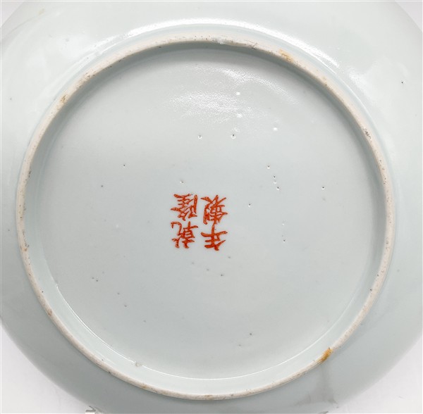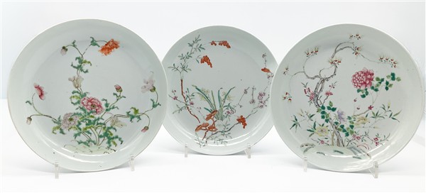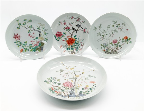 Lotto composto da sette piatti in porcellana Famiglia Rosa con decoro floreale, peonie e ramo fiorito.