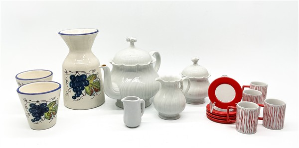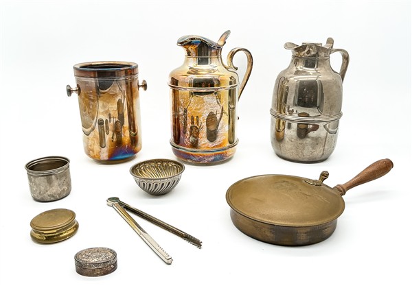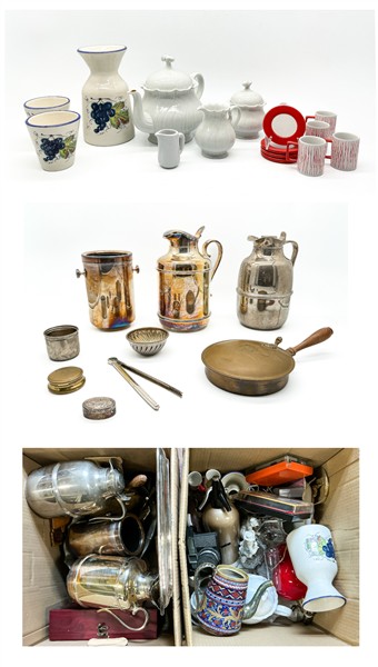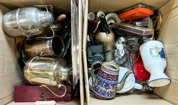 Due cartoni contenenti numerosi oggetti in ceramica, metallo argentato, peltro e altri materiali di diverso uso ed epoca (difetti)