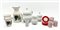 Cartone contenente nari oggetti tra cui una tazza in porcellana cinese, uno svuotatasche Limoges, una macchina fotografica.