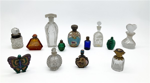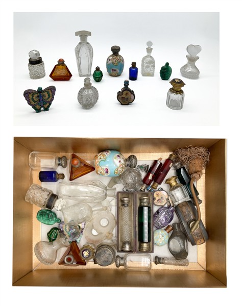 Scatola contenente numerosi flaconi portaprofumo di diversa forma e materiale.