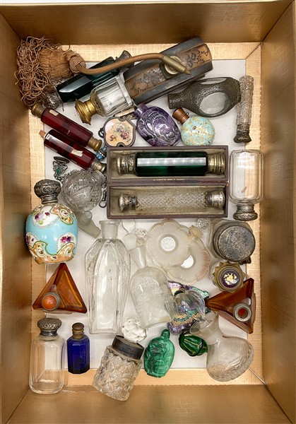 Scatola contenente numerosi flaconi portaprofumo di diversa forma e materiale. Secolo XIX-XX (difetti e mancanze)