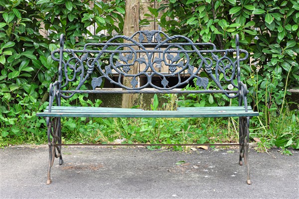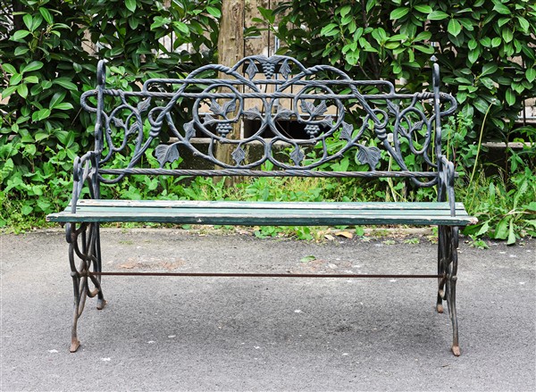 Coppia di panchine da giardino in ghisa verniciata con schienale sagomato a tralci di vite, sedute in legno a listelli (cm 122x85x50) (difetti e rotture)