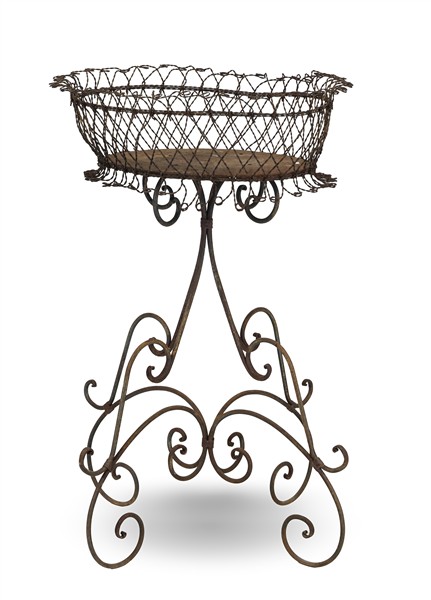 Fioriera in ferro battuto e ritorto di forma ovale a canestro e sostegno con qu