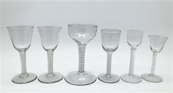 Manifatture diverse, secolo XVIII. Gruppo di sei diversi calici in vetro soffiato con stelo decorato da spirale sommersa, due con decori incisi (h max cm 16) (lievi difetti)
