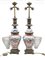 Montate a lampade con base, fregi e parte superiore in metallo (h. tot cm 47) con paralumi (difetti)