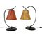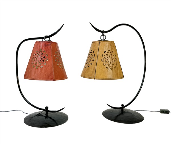 Due lampade d'appoggio con sostegno ad arco e base in ferro battuto e verniciato nero, paralumi sagomati e traforati in pelle (h cm 67 e 60) (difetti)