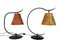 Due lampade d'appoggio con sostegno ad arco e base in ferro battuto e verniciat