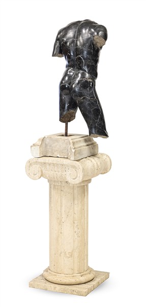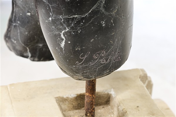 Torso maschile in marmo nero dall'antico su base in marmo bianco, firma incisa "S. Palla" (h cm 75); poggiante su colonna in travertino (h cm 73) (difetti)