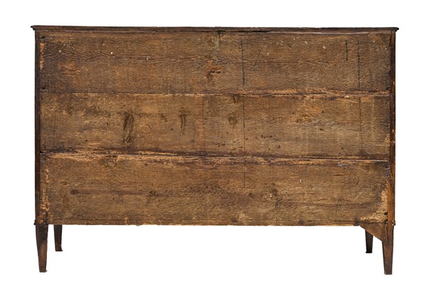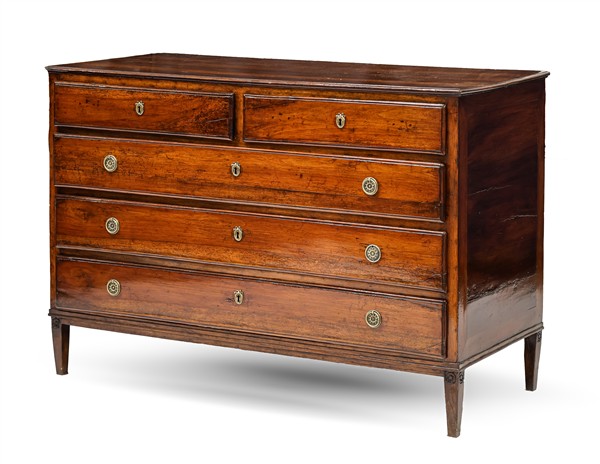 Cassettone in cigliegio con fronte a cinque cassetti di cui due allineati sottopiano, piedi rastremati. Veneto, fine secolo XVIII (cm 140,5x94,5x60) (difetti e restauri)