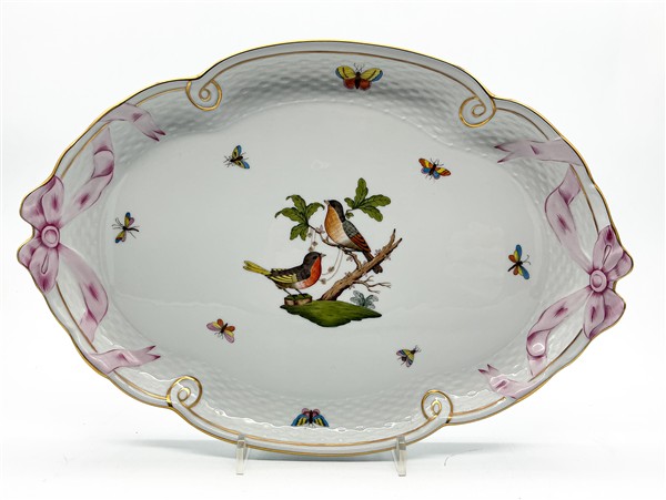 Manifattura di Herend, secolo XX. Vassoio ovale a profilo mistilineo in porcellana dipinta in policromia e dorature con volatili su un ramo e farfalle sparse della serie Rothschild Bird, bordura a rilievo a finto vimini con nastri ai lati (cm 40x28) (lievi difetti)