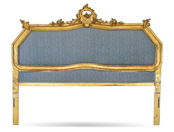 Testiera da letto in legno intagliato e dorato con cimasa traforata a volute e motivi floreali. Riserva imbottita e rivestita in tessuto (cm 190x150) (difetti e restauri)