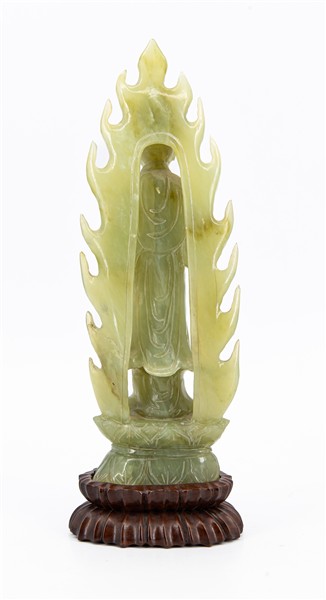 Scultura in giadeite color celadon di Guanyin Cina, secolo XX Su base in legn