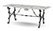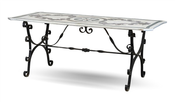 Tavolo da veranda con piano sagomato in commesso di marmi vari decorato a volute, sostegno in ferro battuto con traversa di raccordo (cm 184x73x84) (difetti)