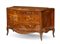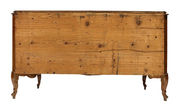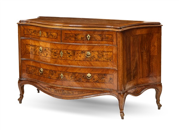 Cassettone lastronato e filettato in legni vari con specchiature in radica, fronte e fianchi mossi, a quattro cassetti di cui due allineati sottopiano, grembiale sagomato e piedi a doppia voluta. Venezia, seconda metà del secolo XVIII (cm 163x93x70) (difetti)