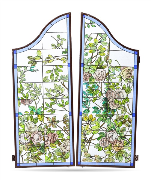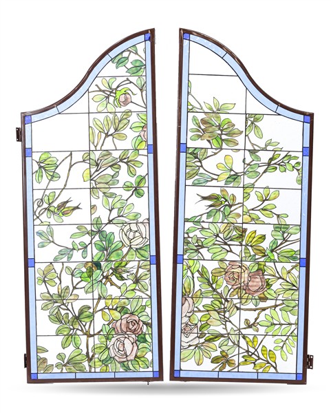 Due coppie di ante di forma sagomata a vetri policromi piombati raffiguranti rami fioriti (cm 112x44 cad.) (difetti e rotture)