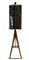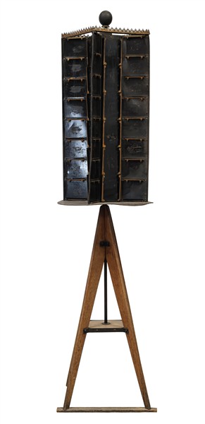 Espositore per cartoline girevole in metallo verniciato nero su sostegno a quattro gambe rastremate, cimatura a sfera. Francia, prima metà del secolo XX (h cm 180) (difetti e mancanze)
