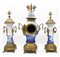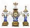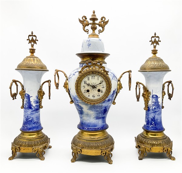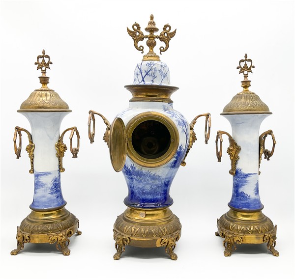 Trittico da camino in metallo dorato e ceramica dipinta nei toni del blu a paesaggio olandese con mulini, composta da coppia di elementi a vaso e pendola da appoggio. Quadrante a numeri arabi, movimento a due treni con suoneria delle ore e mezza su campanello. Seconda metà del secolo XIX (h. max cm 54) (rotture e restauri)