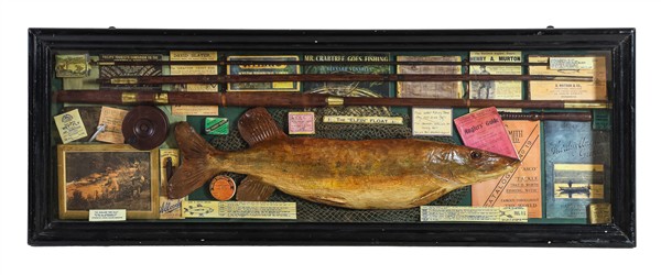 Pesce in tassidermia entro teca lignea corredato da canna da pesca, foto e ritagli inerenti al tema (cm 117,5x42,5) (difetti)