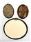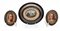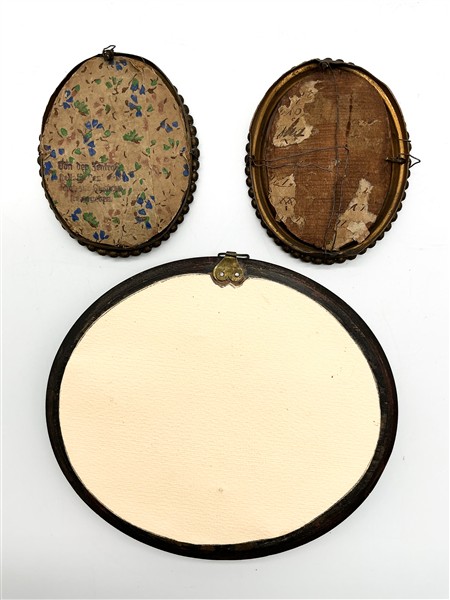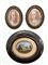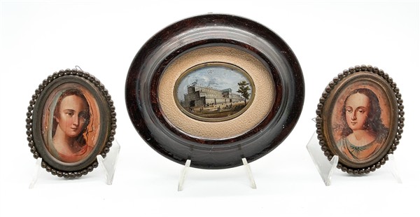 Arte del secolo XIX. Lotto composto da tre miniature su tavola e vetro di cui due raffiguranti volti femminili entro cornici in metallo con bordo perlinato e una con paesaggio entro cornice ovale (cm max 14,5x13) (difetti)